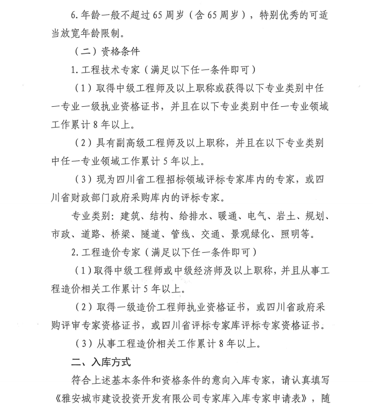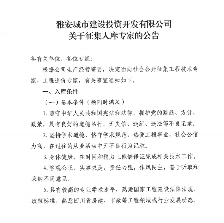 雅安城市建設(shè)投資開發(fā)有限公司關(guān)于征集入庫專家的公告