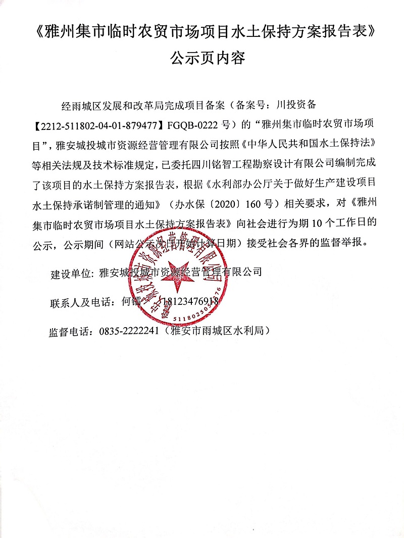 《雅州集市臨時農(nóng)貿(mào)市場項目水土保持方案報告表》公示