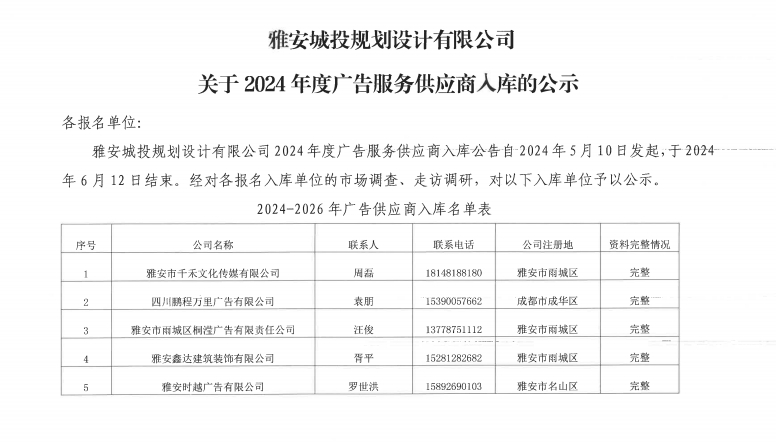 雅安城投規(guī)劃設(shè)計有限公司關(guān)于2024年度廣告服務(wù)供應(yīng)商入庫的公示